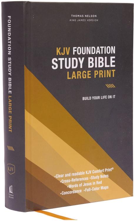 The KJV Foundation Study Bible is the perfect foundation for Bible study and the Christian life. Build your life on it! Now in easy-to-read large print.Available for the first time in large Comfort Print, the beloved Foundation Study Bible is now more readable and helpful than ever! A rich resource for everyone longing to understand more of God’s Word, whether you’re a beginner or an experienced disciple, The Foundation Study Bible includes extensive study helps: verse-by-verse study and theological notes, full-color maps, a concordance, and cross-references. Featuring an easy-to-use layout that is concise and trustworthy, with straightforward and broad study notes that help you study God’s truth, the KJV Foundation Study Bible is a great choice for any Bible student or church leader.Intended for both beginning and experienced students of Scripture who want a Bible that contains the key features of a study Bible in a convenient and portable size, even in large print, the KJV Foundation Study Bible is a solid foundation to build one’s faith upon.Features include:Book introductions give brief background information for more contextConcise study notes provide helpful comments on passages of ScriptureOver 300 theological notes and index draw attention to important doctrinal themesEnd-of-page cross-references direct attention to other passages for further study of words and concepts in ScriptureConcordance provides an alphabetical listing of important passages by key wordsExtensive study aids: book introductions, cross-references, Harmony of the Gospels, Prophecies of the Messiah Fulfilled, The Miracles of Jesus, and Prayers of the BibleFull-color Bible mapsWords of Christ in redClear and readable Comfort Print